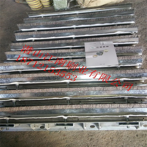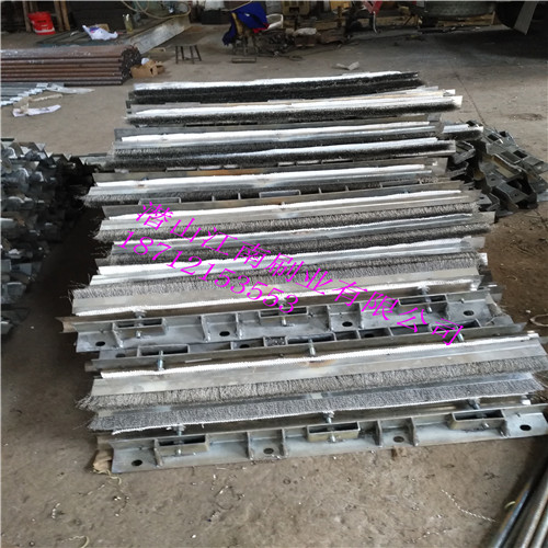 燒結(jié)球團環(huán)冷機漏風(fēng)問題:1對于煙罩問題目前采用耐熱輸送帶或石棉布接觸臺車欄板,但耐熱輸送帶經(jīng)常出現(xiàn)燒毀現(xiàn)象,石棉布雖然耐溫,使用時間長后,出現(xiàn)老化斷裂現(xiàn)象,我們設(shè)計了一種有彈性和韌性的高溫鋼刷密封,煙罩倆側(cè)采用高溫鋼刷與欄板接觸,防止冷風(fēng)竄入。小塊燒結(jié)礦可從鋼刷中通過。當有大塊燒結(jié)礦時,鉸鏈式密封板抬起通過。 2臺車橫梁密封,車輪與橫梁經(jīng)過V字型卸料溝后,橫梁逐漸接近臺車體,為防止快聊卡在中間。橫梁與臺車采用一定的間隙。我們也采用高彈性韌性鋼刷加磁鐵密封,代替原有橡膠密封。 3底部密封,底部采用柔磁性鋼刷密封,高彈韌性鋼刷加磁鐵裝置,使用時撒上精礦粉,與上下滑到精密接觸,但是倆個部分高增加寬度防止跑偏現(xiàn)象發(fā)生。增加密封效果。