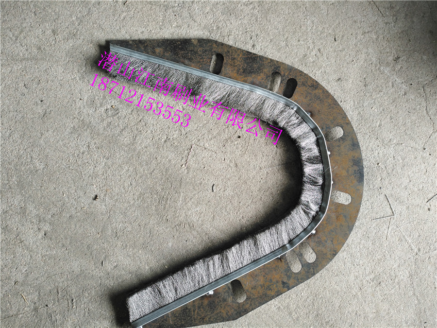 環(huán)冷機臺車在運行當中,出現漏風現象,燒結燃燒不充分,造成能源浪費嚴重,一般密封改造廠家分三種解決辦法:1:機械密封,機械密封就是采用鋼板或者角鋼等來進行密封,但是環(huán)冷機臺車在運行當中鋼板和臺車進行直接接觸,造成硬碰硬的結果就是磨損嚴重,而且還損壞臺車,使用時間短,密封效果在一段時間之后不理想,所以效果不太理想,2:水密封,水密封效果前期比較理想,密封效果好,但是水密封對環(huán)境要求極高,對天氣要求極高,由于鋼廠環(huán)冷機運行惡劣,燒結臺車燃燒后造成的污染環(huán)境大,粉塵進入密封水里,從而使水密封維護相當困難,再一個北方的天氣太冷容易使水結冰,造成水密封后期越來越差,水密封的缺點是后期維護成本太高,后期密封效果不理想,從而否決掉此密封,3:鋼刷式密封,鋼刷式密封采用鋼絲刷進行柔性密封,鋼刷和臺車接觸式不會磨損臺車,柔性密封效果更理想,鋼絲更富有彈性,接觸臺車表面能通過鋼刷的彈性柔性接觸或者跳過,燒結環(huán)冷機是燒結工序重要的燒結礦冷卻設備,環(huán)冷機的冷卻方式為動部件為旋轉臺車,下風箱為靜止部件,通過下風箱將冷卻風導入臺車中,旋轉臺車與下風箱之間構成了動靜密封。因其風量較大、風壓較高,旋轉臺車與下風箱之間的動靜密封效果是影響燒結機環(huán)冷機能耗的主要指標。常見的幾種冷卻方式其中一種為耐熱橡膠側密封,此種方式在使用初期效果非常良好,但是由于橡膠的使用壽命問題及大塊物料撞擊橡膠塊等原因,使用一段時間后橡膠老化導致漏風嚴重,需要停機進行整條橡膠更換,停機對于企業(yè)來說意味著成本增加,且耐熱橡膠成本相比高昂。另外一種較為常見的密封方式為采用鋼絲刷密封,將鋼絲刷固定在密封組件中,此種方式使用壽命長,但相比高溫橡膠的方式密封效果相對較差,其并沒解決礦料撞擊密封裝置導致漏出環(huán)冷機的問題。因此如何提升密封裝置的使用效果和使用壽命是本領域技術人員一直關注的技術問為了解決上述技術問題,本技術提供一種密封效果好,結構簡單,且可實現快換的環(huán)冷機密封裝置。本技術采用的技術方案是:一種快換式環(huán)冷機密封裝置,包括支座,鋼絲刷壓板,鋼絲刷及支腿;鋼絲刷通過鋼絲刷壓板固定在支座的頂部,支腿的一端與支座背向鋼絲刷的側面鉸接,支腿另一端支撐在環(huán)冷機軌道內側。上述的快換式環(huán)冷機密封裝置中,所述的支腿包括固定下支腿和固定上支腿,固定下支腿的上端設有外螺紋,固定上支腿的下端設有內螺紋,固定下支腿的上端與固定上支腿的下端螺接。上述的快換式環(huán)冷機密封裝置中,所述的固定上支腿端的內螺紋的長度大...