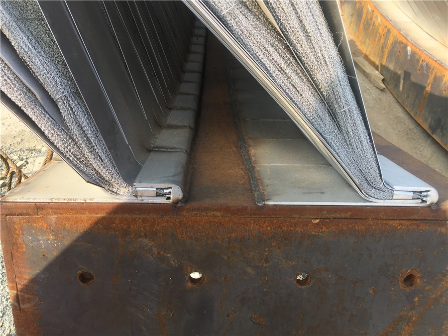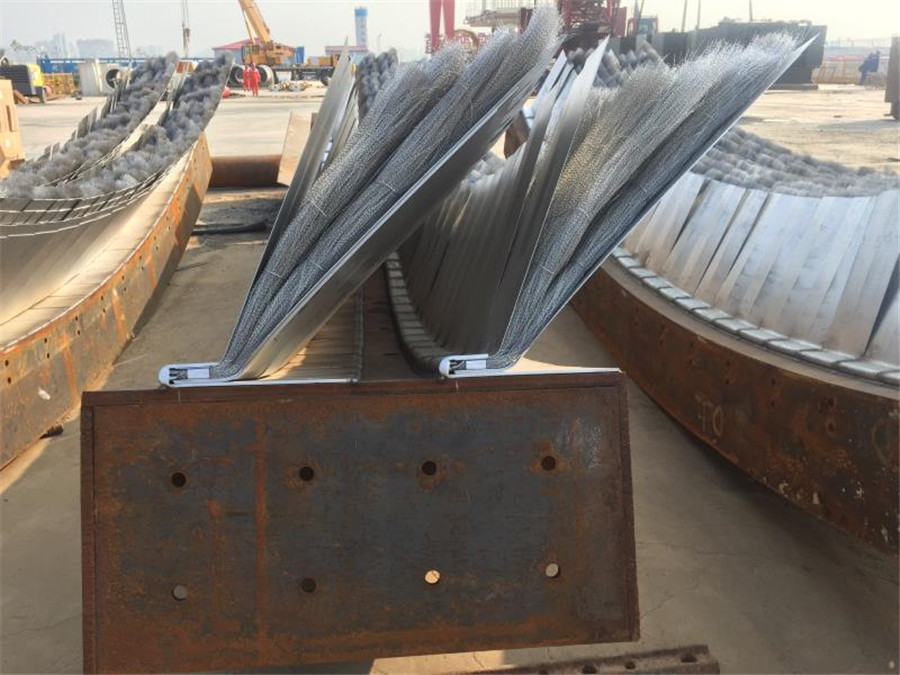利用管片安裝機(jī)將事先準(zhǔn)備好的長(zhǎng)度800mm的16個(gè)撐墊安放于管片與推進(jìn)油缸之間,手動(dòng)將每個(gè)油缸都抵緊撐墊,利用推進(jìn)油缸向前頂推盾構(gòu)掘進(jìn)700mm,此時(shí)露出兩道盾尾刷; 露出兩道盾尾刷示意圖 16個(gè)撐墊布置示意圖 (4)移動(dòng)并伸出管片安裝機(jī)抓舉頭,將點(diǎn)位①處的撐墊固定在安裝機(jī)上,縮回點(diǎn)位①處的推進(jìn)油缸,拆除點(diǎn)位①的撐墊,同理拆除點(diǎn)位②的撐墊; (5)將密封刷及溝槽上的油脂、砂漿等干凈,再開(kāi)始割除尾刷。然后將尾刷割除的***打磨平整,再開(kāi)始焊接新的密封刷。焊完后,在新密封刷上涂抹盾尾密封油脂; (6)利用管片安裝機(jī)安裝點(diǎn)位處的撐墊,將點(diǎn)位①和②處的推進(jìn)油缸將點(diǎn)位①和②處的撐墊頂緊,然后拆除點(diǎn)位③和④處的撐墊; (7)重復(fù)步驟(5),更換新的密封刷,然后按照上述步驟順次更換其余密封刷(每次只拆除相鄰兩個(gè)點(diǎn)位的撐墊) 盾尾密封刷技術(shù)標(biāo)準(zhǔn) 1、保護(hù)板采用SAE1566彈簧鋼,前保護(hù)板為雙層,1.0加0.5,后保護(hù)板為2片1.0加強(qiáng)型,采用特殊工藝(專用壓模)熱處理HRC45-47.確保彈性和耐磨性, 鋼絲刷刷絲采用¢0.3直徑不銹鋼絲,確保彈性,不生銹、不斷裂。 2、銷釘采用低碳鋼(Q345),確保焊接性能和耐磨。 3、尾刷中間絲網(wǎng)采用40目高密度不銹鋼材質(zhì)。 4、上蓋板,底座板,采用Q235。 5、總裝采用專用工夾具和20T專用液壓機(jī)疊加擠壓工藝進(jìn)行總裝 6、焊接工藝采用專用二氧化碳?xì)怏w保護(hù)焊接. 7、成品保護(hù)板熱處理后,,抽檢不低于10%采用20T液壓機(jī)連續(xù)500次沖壓確保產(chǎn)品變形度小于2.5度 8、組裝后的盾尾刷其鋼絲應(yīng)有雙曲且整齊無(wú)亂絲,斷絲,鋼板光滑無(wú)毛邊,兩側(cè)面平整無(wú)細(xì)絲外露,產(chǎn)品表面做防銹處理,每個(gè)成品凈重控制在正負(fù)0.1公斤。